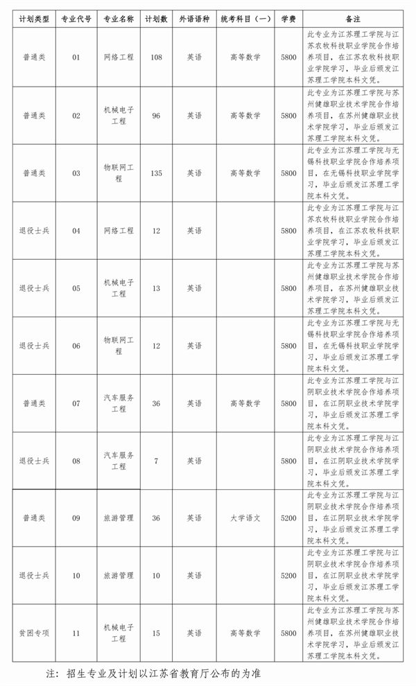 (5)录取的“专转本”学生培养方案由江苏理工学院和合作办学学校共同组织实施,日常教学管理与学生管理工作由学生学习所在学校负责。
