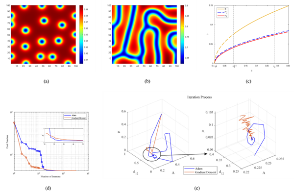 朱霖河副教授团队借助多尺度分析方法,给出了弱非线性系统振幅方程的一般表达式,构造了连续空间与复杂网络信息传播系统中平衡点附近参数与空间斑图点、条形状的对应关系,建立了基于偏微分方程最优化方法的网络系统参数识别理论新框架,借鉴MDOCA和Adam算法改进了传统一阶梯度下降识别方法,突破了损失函数非凸、计算量不确定的难点,显著地提高了反应扩散网络系统参数识别效率。部分研究成果发表在Top期刊Information Science上。