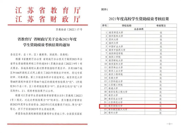 近日,省教育厅、省财政厅联合下发《关于公布2021年度全省学生资助绩效考核结果的通知》(苏教助函〔2022〕17号),南京财经大学再次获评全省学生资助绩效考核“优秀”等次。南京财经大学已连续12年获此殊荣。