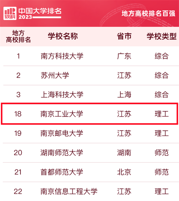 近日,2023年软科中国大学“地方高校”百强榜公布,南京工业大学位列第18位。