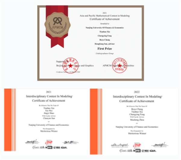 “我第一次参加比赛是在2021年,这也是我第一次参加数学建模竞赛。”刚上大一初次了解比赛时,夏天豪意识到当时自己学习掌握到的知识有限,还没有系统化掌握数据处理能力,于是决定继续沉淀自己。大二时,夏天豪已经有信心,敢于去勇于尝试挑战。惊喜的是,这次比赛,夏天豪在与队友的共同努力下,取得了竞赛一等奖(M奖),也让他收获了许多经验与信心。于是第二年,在同一竞赛的舞台上,夏天豪主动担任队长,发挥他经验丰富、基础扎实的优势,顺利地带领队友再次夺得竞赛一等奖(M奖)。
