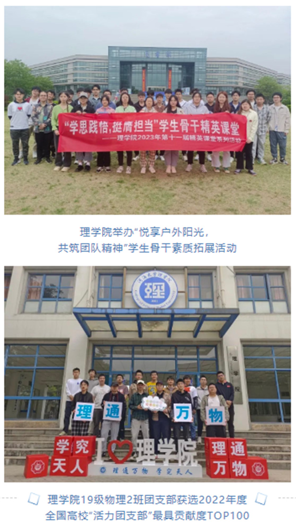 近年来,理学院便秉持“理通万物,学究天人”的院训,以第二课堂成绩单建设为抓手,打造丰富多彩的校园文化活动,营造良好的育人环境,积极引导学生成长成才,不断提高育人质量。在校园文化活动中,打造出了一些具有较高知名度和影响力的金牌活动。举办“河海大学数理文化节”,面向全校学生开展数学物理方面的讲座、培训、趣味活动等,举办“理学之光”系列学术讲座,邀请国内外院士、知名专家、学者做数学物理专题讲座;开展“河海大学廉洁文化衫绘制大赛”、理学院红色话剧节等丰富的文化艺术活动;举办“理学人生”系列职业规划讲座,邀请优秀校友、学长学姐等,围绕就业、保研、考研以及留学等方面分享经验,让新生与优秀学长和学姐零距离接触,感受榜样的力量;开展“理学杯”系列体育比赛,包括师生拔河比赛、乒乓球赛、羽毛球赛、篮球赛等等,为学生提供强身健体的丰富活动。引导学生积极参加志愿服务活动,在实践中,着力培养德智体美劳全面发展的高素质大学生,启明星系列科普实践活动获得了江苏省青年志愿服务大赛二等奖。