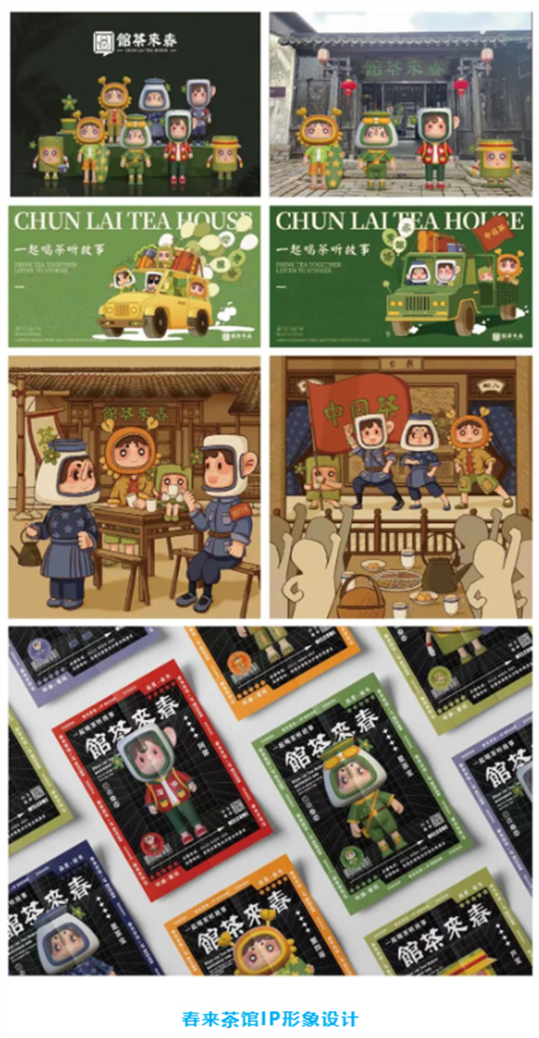 简介:在“春来茶馆”品牌形象设计中,一共有四个品牌IP形象,这四个IP拥有两个款式:当代款和革命现代京剧款。革命现代京剧款的参考依据为革命现代京剧《沙家浜》中的四个不同层级的代表人物。IP的性别、性格、能力、身份、服装都与这四个代表人物的特性相息息相关。当代款IP形象主要体现出勇于冒险、乐于拼搏的精神;革命现代京剧款IP形象主要体现出热血爱国以及坚持传承中国茶的精神。通过当代款和革命现代京剧款的不同服装与设备,形成古今鲜明对比,描绘出IP团队从抗日战争时期跨越到当代,经历了时代的变迁、思想的变革,仍然不忘初心,以一腔热血传承茶文化、红色文化等中国优秀文化。