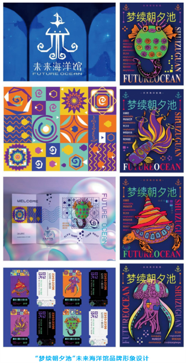 简介:“梦续朝夕池”未来海洋馆品牌形象设计主要是利用“未来”两个文字的字形与海洋动物章鱼的图案相结合,将文字图形化,利用带棱角的直线,高饱和度的、方块分割的蓝紫渐变色来表现未来科技的主题,标志上方添加的小鱼不仅可以打破对称的特性,还可以作为船锚,使标志更加生动有趣。辅助图形提取了标志中的结构,利用点线面表现海洋的漩涡、海里的鱼儿、未来穿梭的时空门等等,配合富有赛博朋克风格的高纯度色彩,突出梦幻未来海洋馆的品牌理念。