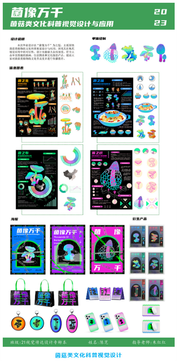 简介:本次毕业设计以“菌像万千”为主题,主要围绕菌菇类植物的文化科普视觉设计与应用展开研究,将野生菌作为研究对象,结合其外型、生长条件、地区分布等特点,绘制一套有科普教育意义且符合现代人审美的信息可视化图表。深入探索信息可视化图表在信息时代的应用与创新,并将其融入到文化宣传产品当中,加强大众对菌菇类植物的了解,并进行传播教育。
