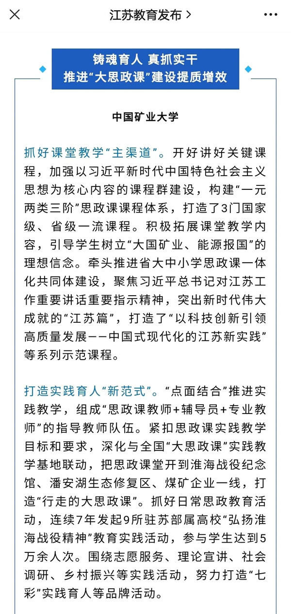 “大思政课”育人成效显著提高,学生报效祖国、服务人民的信念更加坚定,每年60%以上的就业毕业生选择服务基层,根据省教育厅招就中心调查数据,用人单位对中国矿业大学毕业生总体满意度达到98.9%。