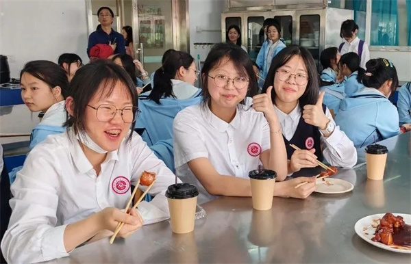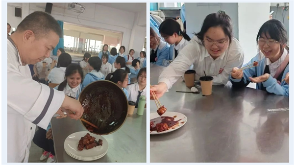 同学们通过体验锡菜传承项目,了解无锡酱排骨的原料选择、生产工艺和技术标准,并进行现场品鉴。
