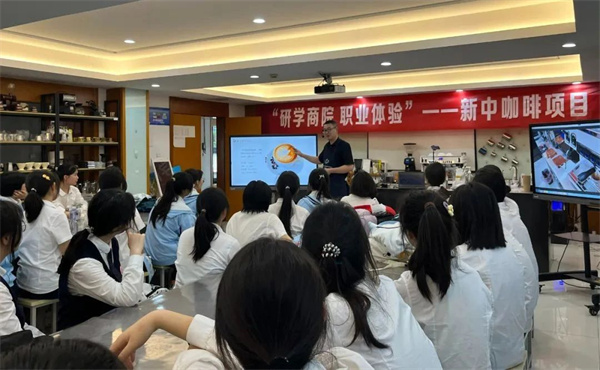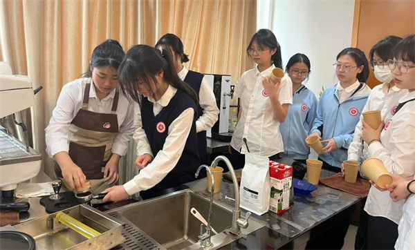 同学们通过体验新中咖啡项目,了解半自动咖啡机的操作流程和规范、学习奶泡打发的技巧,制作并品尝属于自己的第一杯拿铁咖啡。