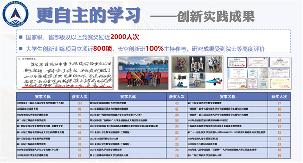 近两年,通过在班资格考核的长空创新班毕业生升学深造率达100%,53人保送本校深造(32人入选学校本博贯通培养计划),研究生导师均分布于我校优势学科下的院士团队或百强创新团队;51人保送清华大学、北京大学、北京航空航天大学等国内知名高校,5人赴美国宾夕法尼亚大学、新加坡南洋理工大学、英国爱丁堡大学等QS排名前50的海(境)外名校深造。