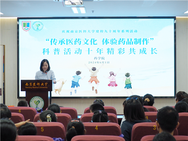 活动由药学院党委刘明捷书记致辞。今年是南京医科大学建校90周年,药学院儿童科普活动也举办了十年整。十年来,药学院先后有200多名师生党员接续参与组织和服务,面向群众,服务社会,弘扬医药文化,为儿童科普贡献力量。这是一种情感的传递,更是一种文化的传承,在孩子们的心里种植医药文化的种子,更期待着种子的生根发芽!希望小朋友们通过活动,了解父母的工作,通过零距离沉浸式体验药品制作,激发科学梦想和勇于探索的精神,成为出色的医二代和药二代!