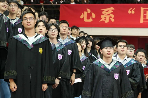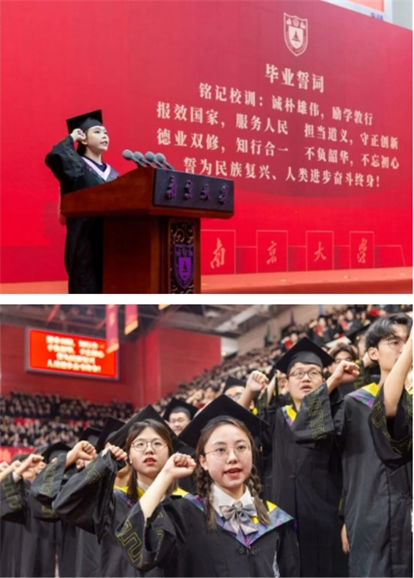 “报效国家,服务人民。担当道义,守正创新。德业双修,知行合一。不负韶华,不忘初心。”全体毕业生庄严宣誓,立志为民族复兴、人类进步奋斗终身。