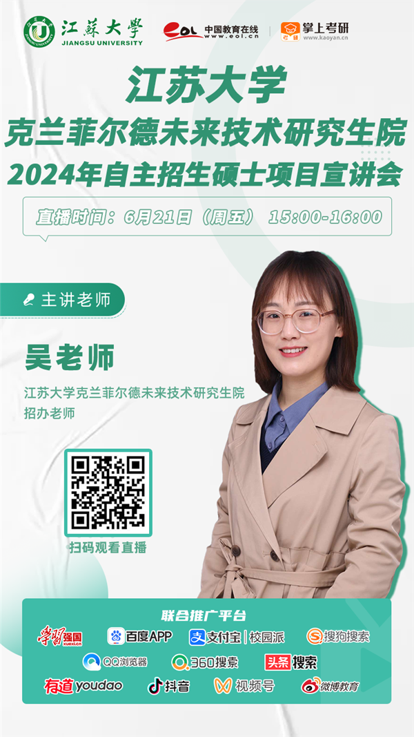 江苏大学克兰菲尔德未来技术研究生院招办吴老师将进入直播间,为考生带来干货满满的线上招生宣讲,全面介绍学院发展、学科概况、专业特色、人才培养、奖助学金体系、就业前景等,帮助大家进一步了解江苏大学克兰菲尔德未来技术研究生院的研究生招生与培养信息。
