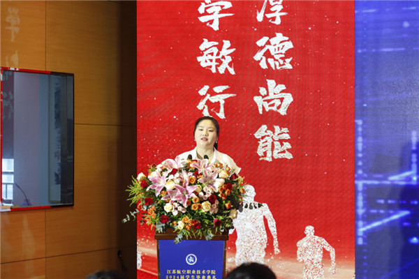 学院党委委员、副院长陆纪荣宣读江苏航院2024届优秀毕业生表彰决定,王童、左靖薇、孙思嘉三位同学荣获江苏省普通高校“优秀毕业生”表彰,陆纪荣并为他们颁发荣誉证书。