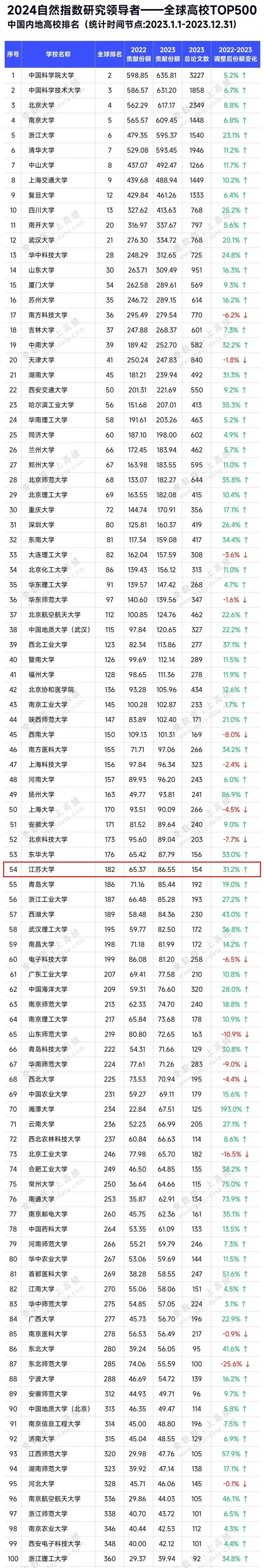 数据显示,江苏大学位列全球高校182位,中国内地高校54位,2022-2023“调整后的份额”增长了31.2%。