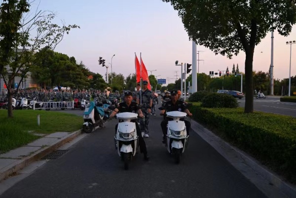 夕阳洒落的古运河畔,绿树成荫的广陵校园内,微风正托举起一面面红色的旗帜,飘扬在一列列整齐肃立的“迷彩蓝”前。拉练在院长凌云志检阅完各连队方阵之后正式开启。据悉,本次拉练是扬州大学广陵学院首次举行军训拉练,以学院西门为出发点,途经邗江南路、高旻寺路和扬子津路,路线总长约8公里,设置7个志愿者服务站,安保人员、医务人员等部门通力协作保障拉练顺利进行,同时备有饮用水、医疗物资等为新生们的安全保驾护航。