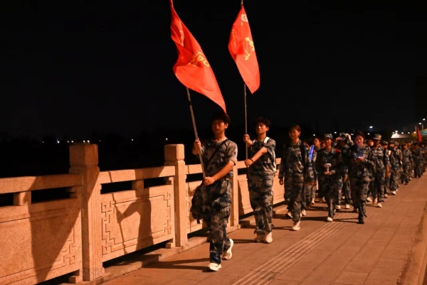 太阳逐渐西沉,学子们披着星光前行,沿途的风景从最初的赏心悦目变得模糊,取而代之的是对终点的渴望和对身体极限的挑战。汗水浸湿了衣背,疲惫拉动着每一条肌肉,但大家目光坚定、步伐有力,相互鼓励,相互支持,将每一滴汗水都化作成长的养分,每一次挑战都转化为前行的动力。教官们则不时地调整队伍节奏,用他们坚毅的眼神和激励的话语,给予学生们前进的力量。