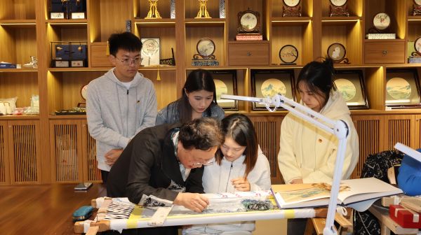 “上世纪末国企改制,许多刺绣工人纷纷下岗,我的姑姑也同样下岗了。当时,我就在想如果扬州刺绣都没有人做了,那肯定会逐渐消失的,抱着一定要传承下去的决心,我把一些姐妹们集中到自己家中继续做刺绣,守着扬绣这门手艺。”带领团队参观工作室时,吴大师回忆起曾经的过往,她表示,是姐妹们的互相坚持、坚守,大家才成功渡过了最艰苦的阶段。1999年,扬州漆器厂组建了“扬州民间艺术馆”,吴哓平大师与其徒弟加入其中,组建了自己的刺绣工作室。多年来,吴哓平大师的工作室出品获奖无数,培养了许多刺绣新秀,为扬州刺绣的传承和发展做出巨大贡献。成员们也在吴大师的指导下切身体验扬绣的精细。