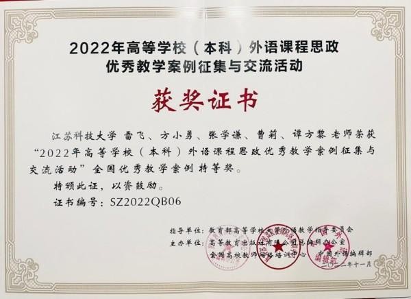 一直以来,江苏科技大学外国语学院以学生发展为中心,以学校特色为依托,系统升级重构教学内容,坚持贯彻学用一体,完善考核评价体系,探索并整合外语教学与课程思政的协同育人新模式。大学外语课程紧密围绕学校办学定位与人才培养特色,深挖教材思政元素,发掘课外思政资源,在提升语言水平的同时,从情感、认知、行为三个方面对学生进行正面积极的引导,帮助学生树立正确的理想信念,助力学生成才与发展。
