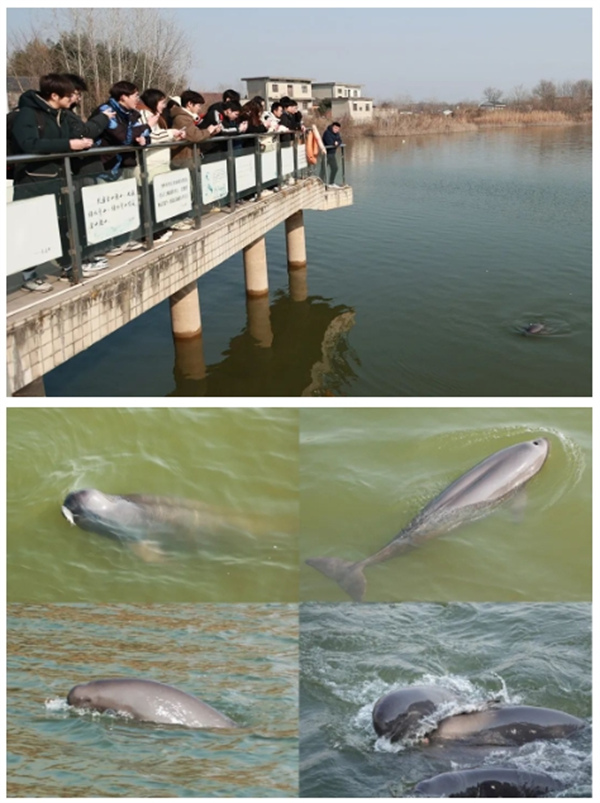 此次社会实践,团队成员在长江豚类保护专家章贤和张明浩两位老师的带领下,通过乘船观测和岸上观察的方式,考察长江铜陵江段干支流长江江豚栖息地,观察野生长江江豚群体和迁地保护水域长江江豚群体,进入保护区标本馆(宣教馆)参观学习,并与保护区一线长江豚类保护专家深入交流。