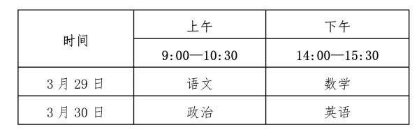 考生须参加高考报名所在地省级招生考试机构组织的文化考试。考试科目:语文、数学、政治、英语四科;考生分值:每科满分为150分,总分600分。