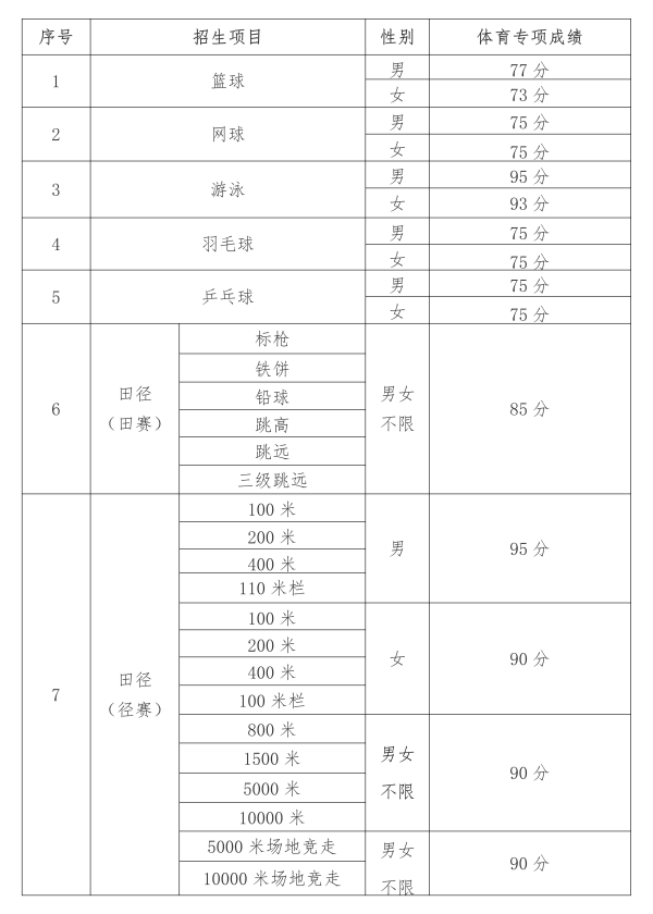 考生思想政治品德考察与体检合格,在达到我校文化成绩和体育专项成绩录取控制线的基础上,根据考生的文化成绩(折合百分制后)和体育专项成绩3:7的比例进行综合评价,计算考生录取综合分。具体公式为:综合分=(文化成绩/6)×30%+体育专项成绩×70%。综合分计算时保留小数点后两位,采用四舍五入计数保留法。