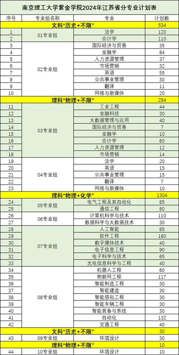 南京理工大学紫金学院2024年江苏省分专业计划表