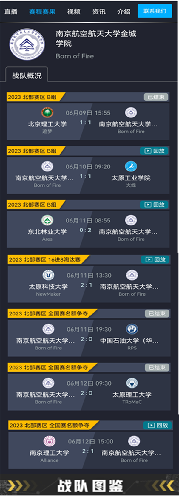 本次比赛,在前期的小组循环赛中,通过抽签南京航空航天大学金城学院的BOF战队被分到北部赛区“死亡之组”,遭遇到今年黑龙江省赛冠军东北林业大学、山西省赛冠军太原工业学院、殿军北京理工大学,南京航空航天大学金城学院BOF战队全体成员不畏强敌、奋勇拼搏,以高效的战术配合,最终以不败战绩成功挺进16强,在16进8和晋级名额及复活赛名额争夺中,分别遭遇“太原三杰”的太原科技大学和太原理工大学,2022年东部区域赛冠军中国石油大学(华东)以及老对手南京理工大学,最终以2胜2败的战绩,排名第十取得深圳总决赛复活赛资格。本次比赛,东北大学、哈尔滨工程大学、东北林业大学分别荣获区域赛冠、亚、季军。