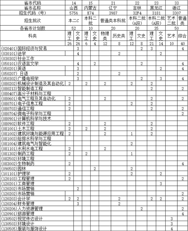 01 山西省、内蒙古自治区、辽宁省、吉林省、黑龙江省、浙江省分专业招生计划一览表