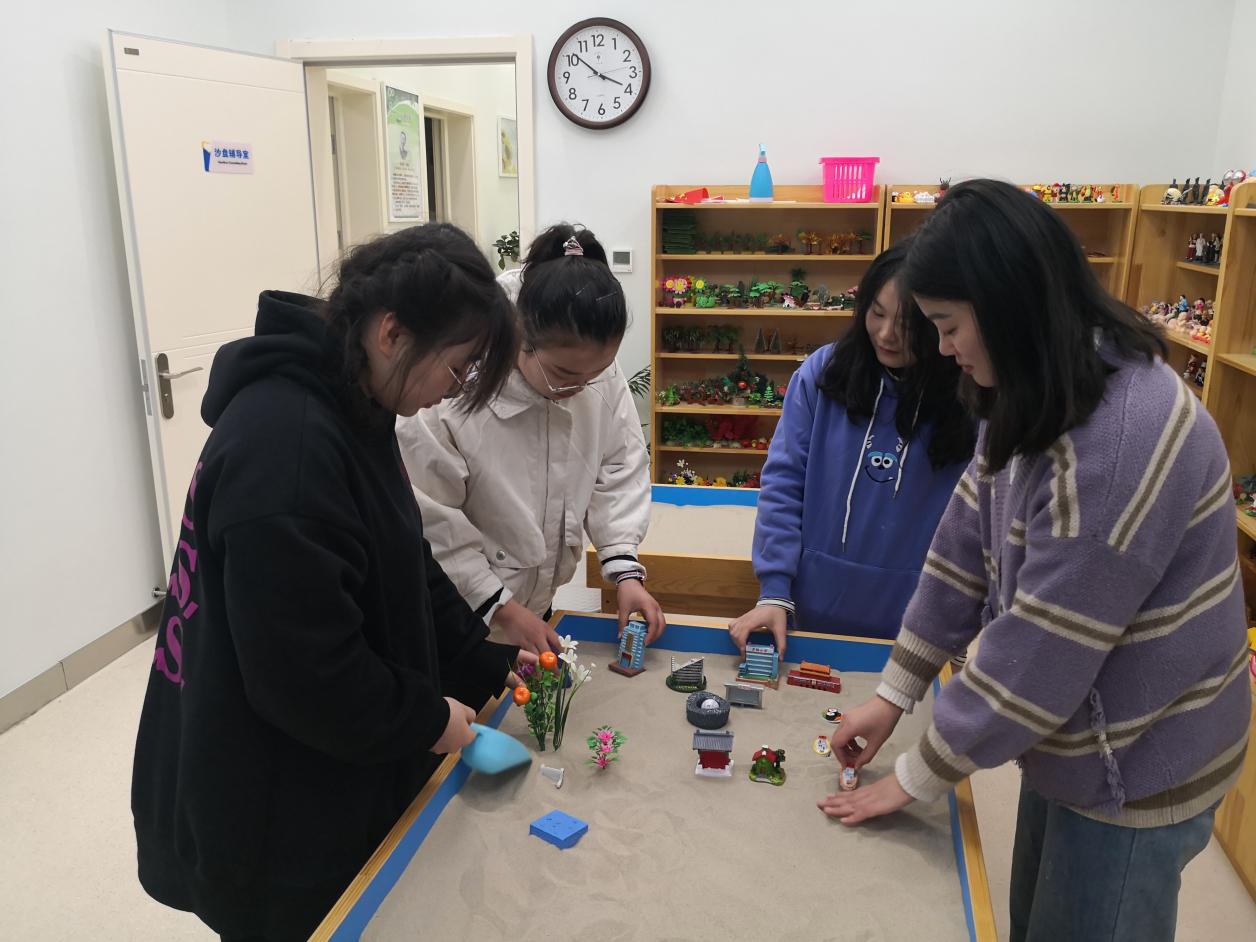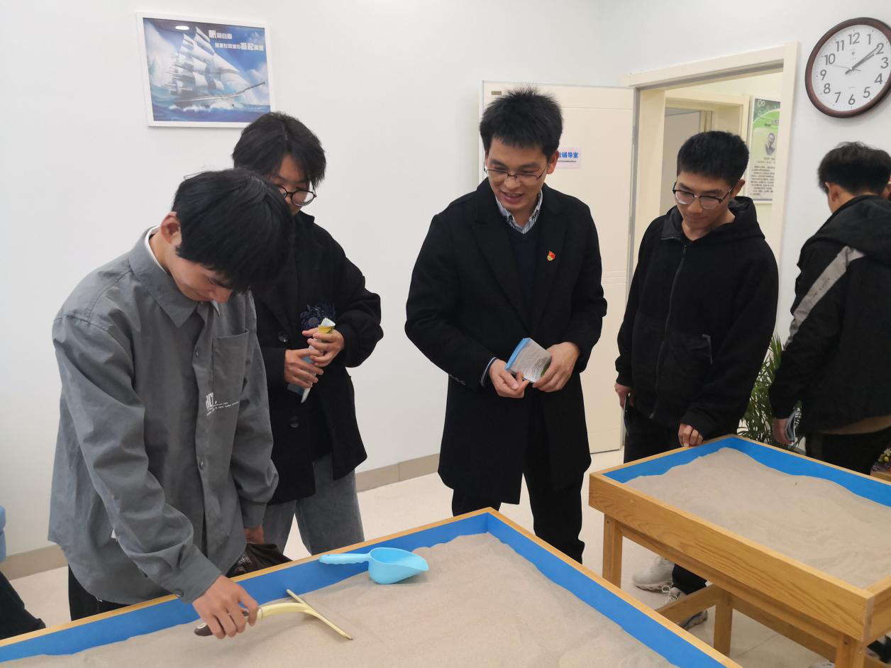 在沙盘室里,同学们对沙盘架和柜子里的小摆件非常感兴趣,仿佛回到了童年,过家家、玩沙子、盖房子……在讲解员的介绍下,同学们了解了沙盘辅导不同于儿时的游戏,而是在专业心理咨询师的指导下,通过构建特定的场景,进行自我探索和自我分析。