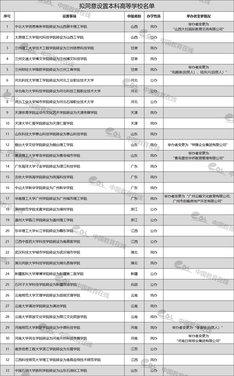 根据《188金宝搏beat官网登录 法》《普通高等学校设置暂行条例》《普通本科学校设置暂行规定》和《关于加快推进独立学院转设工作的实施方案》等法律法规政策规定,经第七届全国高等学校设置评议委员会专家考察和评议,并经党组会审议,拟同意中北大学信息商务学院等33所独立学院转设为独立设置的本科学校,现将学校名单等信息向社会公示。