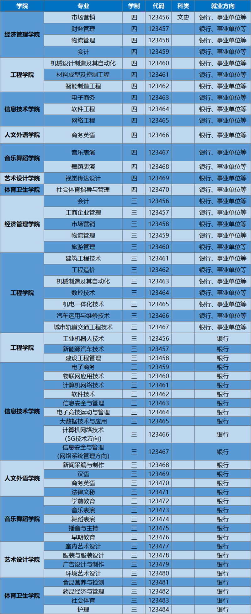 学校设有经济管理学院、工程技术学院、信息技术学院、艺术设计学院、人文学院、体育/卫生健康学院、音乐舞蹈/教育学院、马克思主义学院、创新创业学院。学校引进京东、华为、中兴等多家企业,共同创办产教融合实训基地,共建专业、共育人才,培养具有扎实理论知识的高素质技能人才。学校瞄准现代服务业、先进制造业、战略新兴产业和“互联网+”新业态,开设本科专业13个、专科专业47个,形成了商务管理、智能制造、信息技术、艺术创意、文化教育骨干专业群。