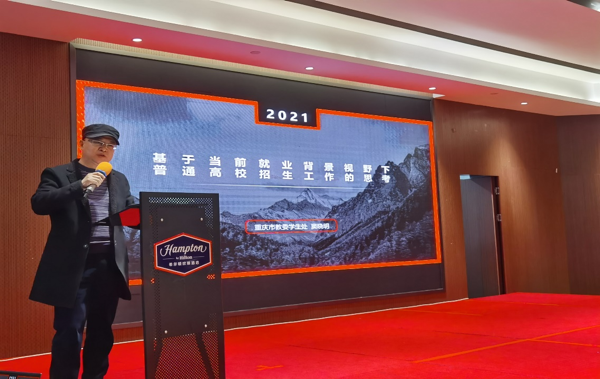 重庆市教育委员会学生处处长窦晓明做了《基于当前就业背景视野下,普通高校招生工作的思考》的主题报告。窦处对当前就业形式进行了分析,由就业难反拨效应到招生难话题延伸到高校招生问题,并给出了围绕发展明确定位、紧扣产业优化结构、计划互换跨省招生、部门联动调整结构、不忘初心按专业(类)招生、坚持底线维护秩序的6个对策建议。