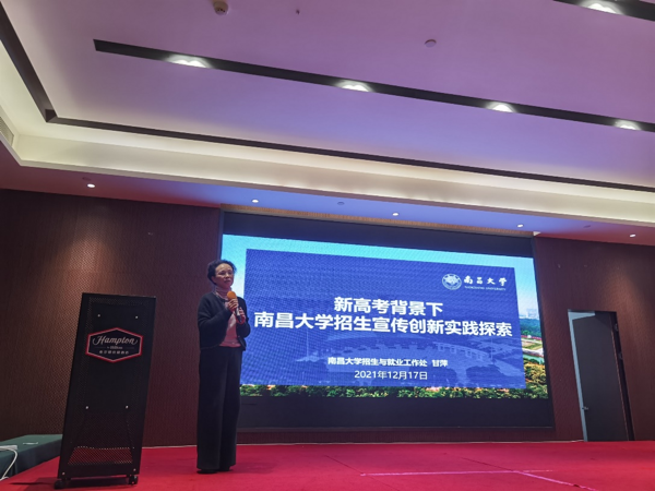 在高校招生分享环节,南昌大学招生就业处处长甘萍,以《新高考背景下南昌大学招生宣传创新实践探索》做主题分享。她详细介绍了南昌大学在招生宣传中的创新做法,并分享了应对新高考的相应举措。甘处长表示,南昌大学对待学生都是拿出“招进来、扶上马、送一程、护一生”的态度去培养。