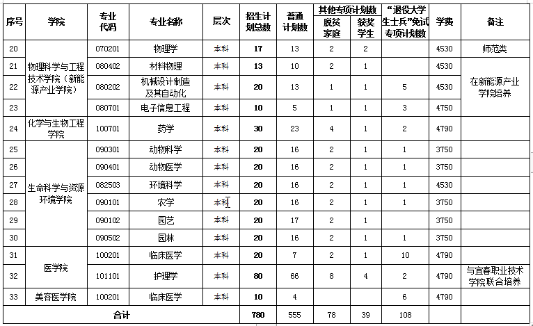 2022年我校专升本按“退役大学生士兵”免试计划、“其它专项计划”(包含脱贫家庭学生、获奖学生<含高水平运动员>专项)和“普通计划”三大类进行招生。招生计划共780人,具体详见《宜春学院2022年专升本招生专业及计划数一览表》。实际招生专业及计划数以省教育厅、省教育考试院公布为准。