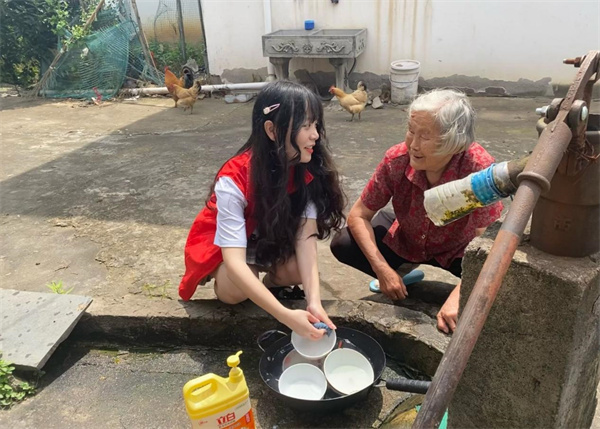 图为江西农业大学南昌商学院“三下乡”志愿服务团员在帮助老奶奶洗碗。
