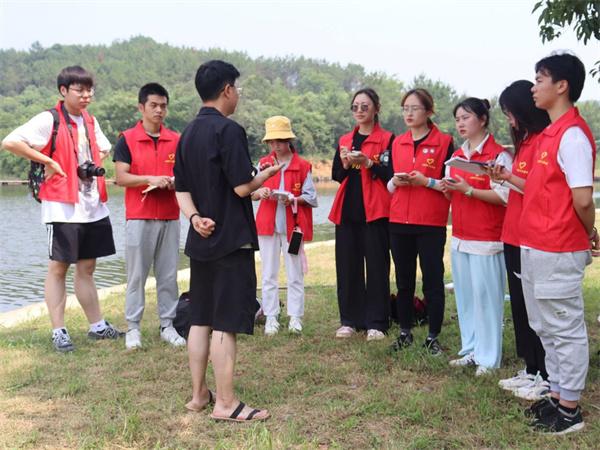 图为志愿者向潘家湾研学旅行基地负责人了解园林绿化工程、基地建设投入、自媒体宣传方式、盈利经营模式等内容