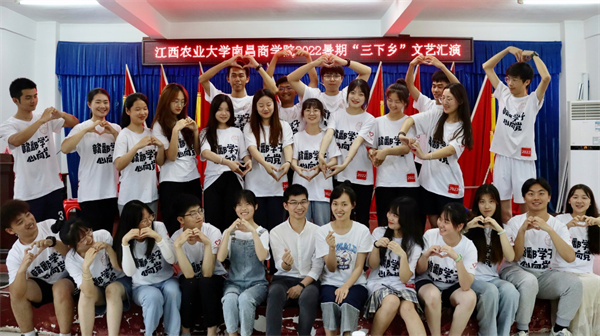 图为江西农业大学南昌商学院“三下乡”志愿服务团员举行文艺汇演集体合照。