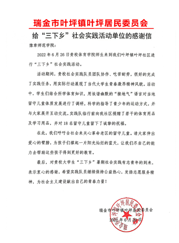 6月25日至29日,豫章师范学院体育学院“乡村体育振兴”服务队赴赣州瑞金市开展暑期“三下乡”社会实践活动,教育引导青年大学生在实践中厚植爱国情怀,在火热的实践锻炼中锻炼自己、奉献社会。