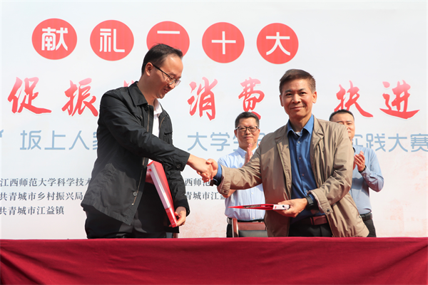 肖接增与共青城市江益镇党委书记康科峰签订校地共建协议。陈志丹与共青城市乡村振兴局局长余会林为乡村振兴工作室揭牌。熊南菲与江益镇党委副书记、镇长刘浩波为坂上人家共青城农产品展示体验店(江西师范大学科学技术学院店)揭牌。