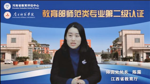 省教育厅师资处处长陈露代表省教育厅对专家们开展线上认证考查工作表示热烈欢迎和衷心感谢。她强调了开展师范类专业认证的重要意义,希望各位专家为南昌师范学院把脉问诊、积极建言献策、帮助学校查找不足,开出良方。南昌师范学院要以此次师范类专业认证为契机,坚持学生中心、产出导向、持续改进认证理念,进一步明确专业发展的目标,主动对接基础教育改革的发展需求,持续改进相关工作,完善顶层制度设计,尽快补齐短板,不断加强专业内涵建设,提高教育教学质量。