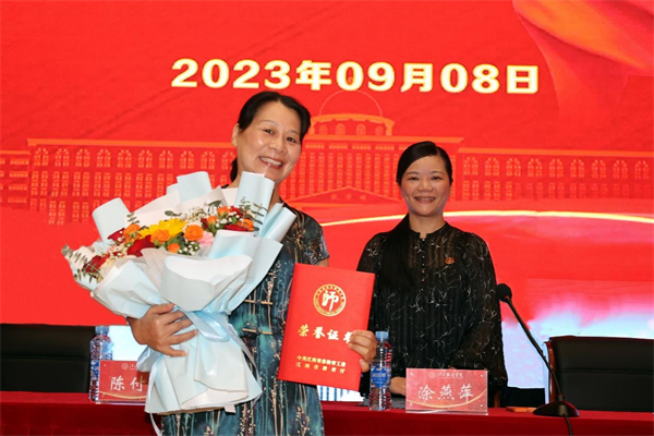 理事长涂燕萍为荣获“三十年从教”荣誉的张小美教师献上鲜花和荣誉证书。