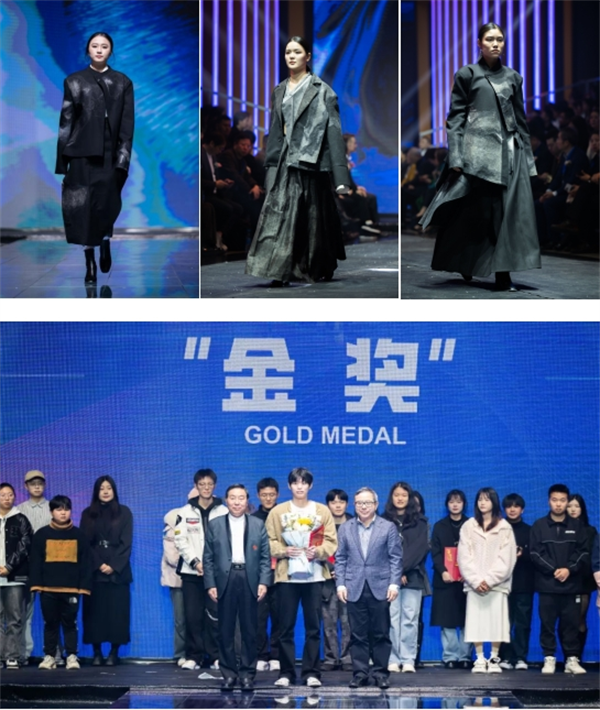 江西服装学院校长薛家宝、中国纺织服装教育学会会长倪阳生为金奖获得者颁奖