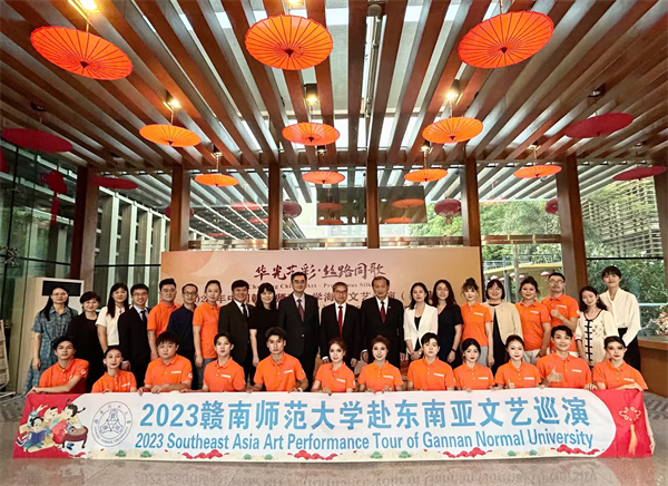 在共建“一带一路”倡议提出十周年之际,受金博宝最新官方网站查询网址 中外语言交流合作中心、江西省教育厅委派,11月29日,赣南师范大学东南亚文艺巡演团访问宣素那他皇家大学,与宣素那他皇家大学皇家艺术团在“华光艺彩·丝路同歌”舞台上同台演出,并与学校师生进行艺术交流。