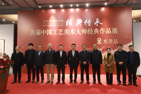 3月10日,江西艺术基金资助项目《经典传承——历届中国工艺美术大师经典作品展》鹰潭站在鹰潭美术馆盛大开幕。南昌工学院党委副书记、南昌应用技术师范学院校长陶也青致欢迎词,江西工艺美术学会理事长、中国工艺美术大师博物馆馆长熊建新致答谢词,江西省文化艺术基金代表、江西省政协常委、原江西省画院院长、江西省美术馆馆长刘杨发言,中共鹰潭市委常委、宣传部部长黄忠宣布开幕,开幕式由鹰潭市文广新旅局局长倪爱华主持。