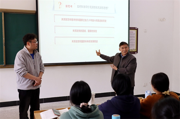 为深入贯彻落实习近平总书记关于“大思政课”建设的重要指示批示精神,扎实推进思政课教学改革创新,根据江西师范大学科技学院提高思政课教学质量的总体规划,3月20日上午,院党委书记肖接增携手思政部青年教师袁超,在《毛泽东思想和中国特色社会主义理论体系概论》课堂上,围绕“毛泽东思想及其历史地位”专题,为2022级翻译专业班同学开展了一堂别具风格的“双师同堂”示范课。教学效果极佳,深受学生好评。