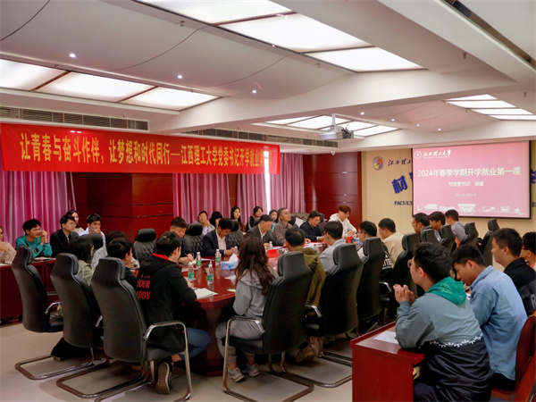 3月26日上午,江西理工大学党委书记杨斌来到稀土学院为师生上“开学就业第一课”。稀土学院班子成员、就业辅导员及学生代表共同聆听。讲座由稀土学院院长汪航主持。