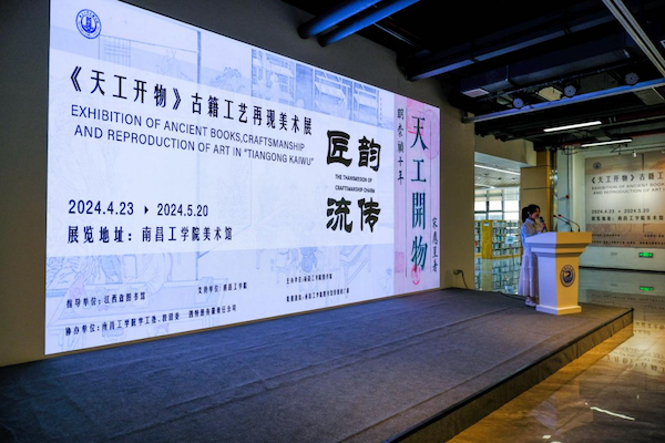 策展人柏洪,在展览介绍中提到,本次展览主要选取宋应星的《天工开物》内容,形成主要框架,分为4个章节:“科学巨匠宋应星”、“典籍天工 科技之光”、“物华天工 开物育人”、“天工名画 继往开来”。第一章主要是展示和介绍宋应星“其人、其事、其书”;第二章主要展示的是清代李清渊的《玉作图》和《中国古代造纸场景图》,展示了12道制碢工艺和27道造纸工序;第三章展示的是唐代张萱的《捣练图》,这也是二十四节气美学空间的壁画参考原图;第四章展示的是四特天工酒的8个传统工艺制作流程,以及其采纳《天工开物》中记载的天工九法。