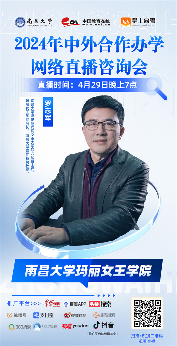 为帮助各位考生和家长更全面地了解我校中外合作办学招生,我校现参与金宝搏188入口 ·掌上高考于4月29日举办的“2024年中外合作办学网络直播咨询会”活动,罗志军老师将与大家相约云端,通过网络直播的方式为各位详细解读我校2024年中外合作办学项目招生政策变化、人才培养模式、学费详情等内容,并为各位考生及家长答疑解惑。