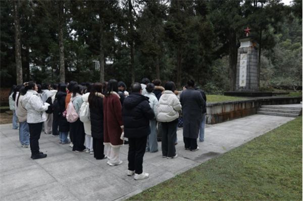 在黄洋界,学员们在茂林雾海中拾级而上,参观了黄洋界保卫战时期阻击敌人的防御工事和炮台,看到了刻有毛主席题写“星星之火,可以燎原”的纪念碑,体验了朱毛同红军战士一起挑粮走过的“挑粮小道”。回溯至1928年8月30日,那场惊心动魄的黄洋界保卫战仿佛历历在目——“山下旌旗在望,山头鼓角相闻。敌军围困万千重,我自岿然不动。早已森严壁垒,更加众志成城。黄洋界上炮声隆,报道敌军宵遁”。这场战役见证了无数英勇先烈在此地不惜牺牲生命,以血肉之躯捍卫着初生的红色政权。如今,江服“寻访红色足迹,筑梦青春之旅”的学员们亲自踏上这片神圣的土地,心中涌动的不仅是对历史的敬畏,更是对革命先烈无尽的崇敬与缅怀。