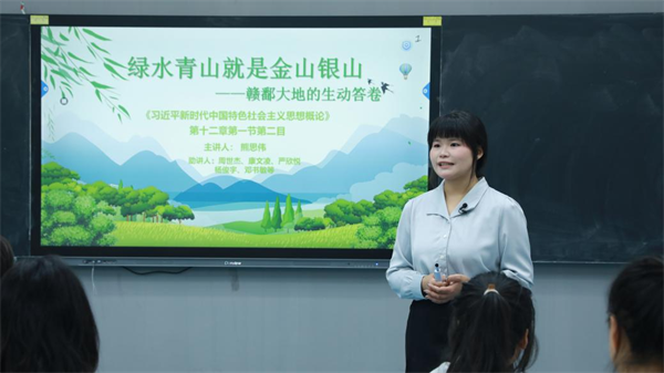 同日,在“绿水青山就是金山银山”专题教学中,思政课教师熊思伟与周世杰、康文凌等学生助讲团共同授课,通过案例分析、互动讨论等方式,探讨生态环境保护与经济发展的辩证关系。课堂上,学生结合江西南矶山、井冈山神山村等地的生态发展实践,分享对“两山”理论的理解与认识,展示江西省在生态保护与经济发展方面的成效。同时,学生还结合服装设计专业的学习实际,从绿色设计角度,探讨可持续发展理念在专业领域的应用。